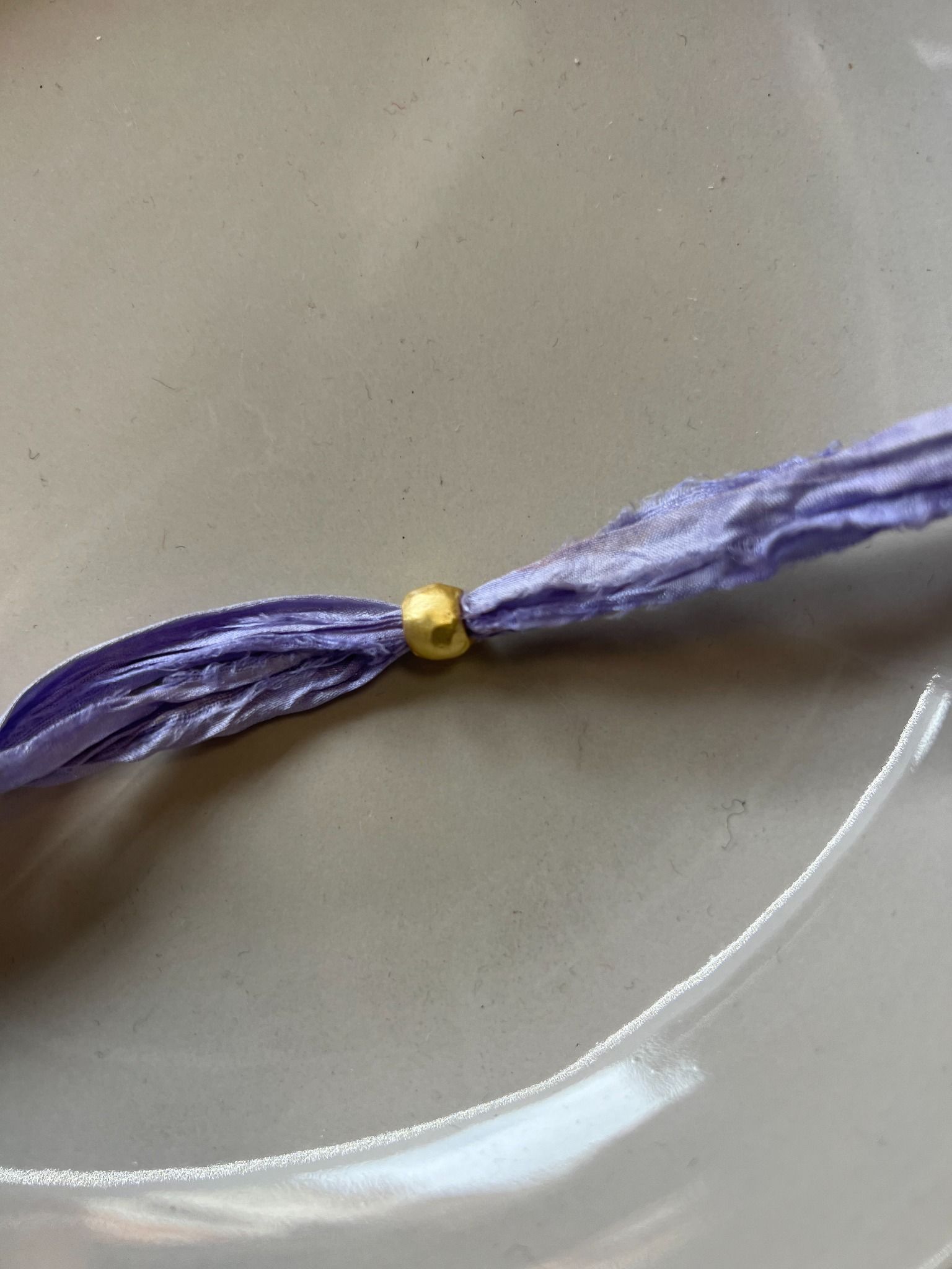Colgante con piedra natural azul en bruto, engastada en baño de oro y detalle central en piedra negra facetada. Suspendido de auténtica seda sari reciclada en tono lavanda, cada pieza es única y ligeramente distinta.