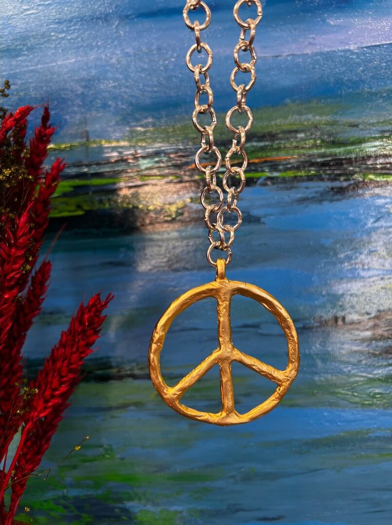 Collar de eslabones en aluminio italiano con colgante símbolo de paz en latón laminado en oro, una pieza protagonista diseñada para no pasar desapercibida.