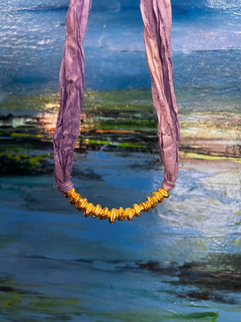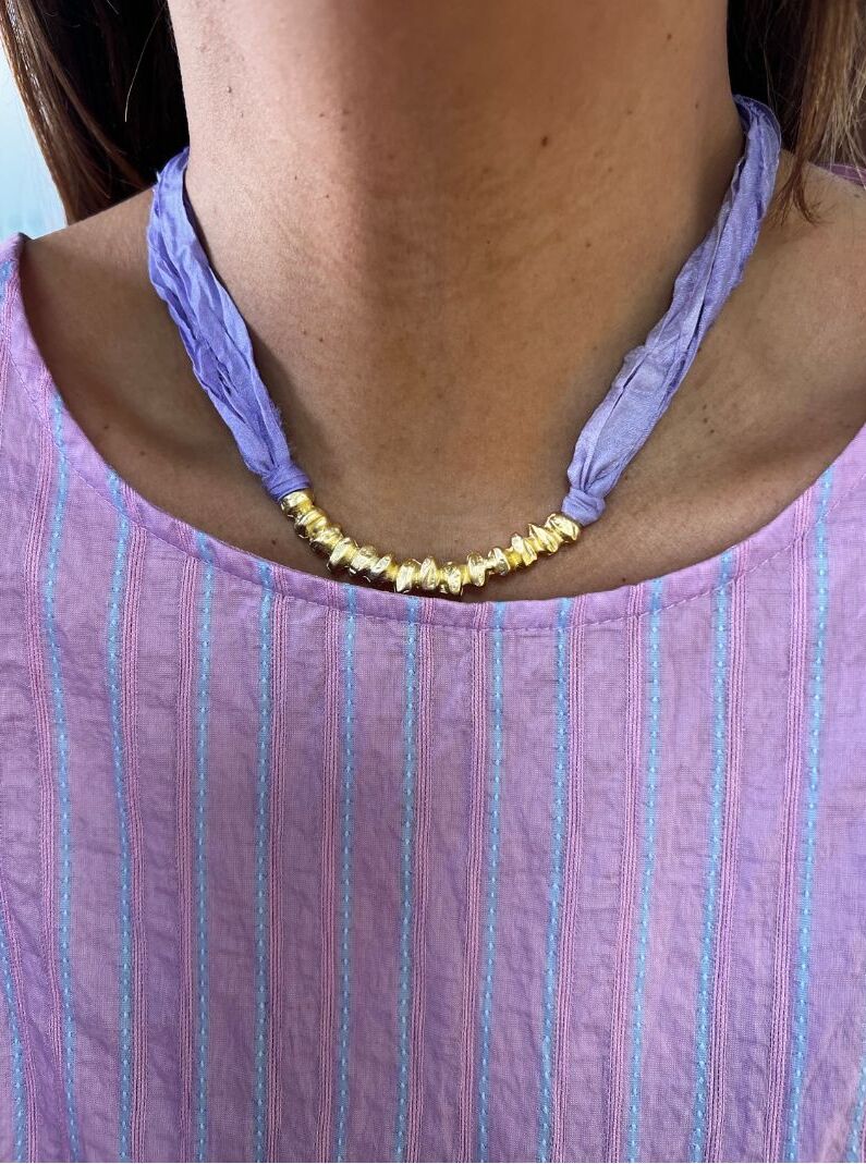COLLAR DE SEDA SARI EN TONO TERRACOTA CALABAZA CON BARRA EN ORO MATE ONDULADA, PIEZA VERSATIL QUE APORTA CALIDED Y SOFISTICACION A CUALQUIER LOOK