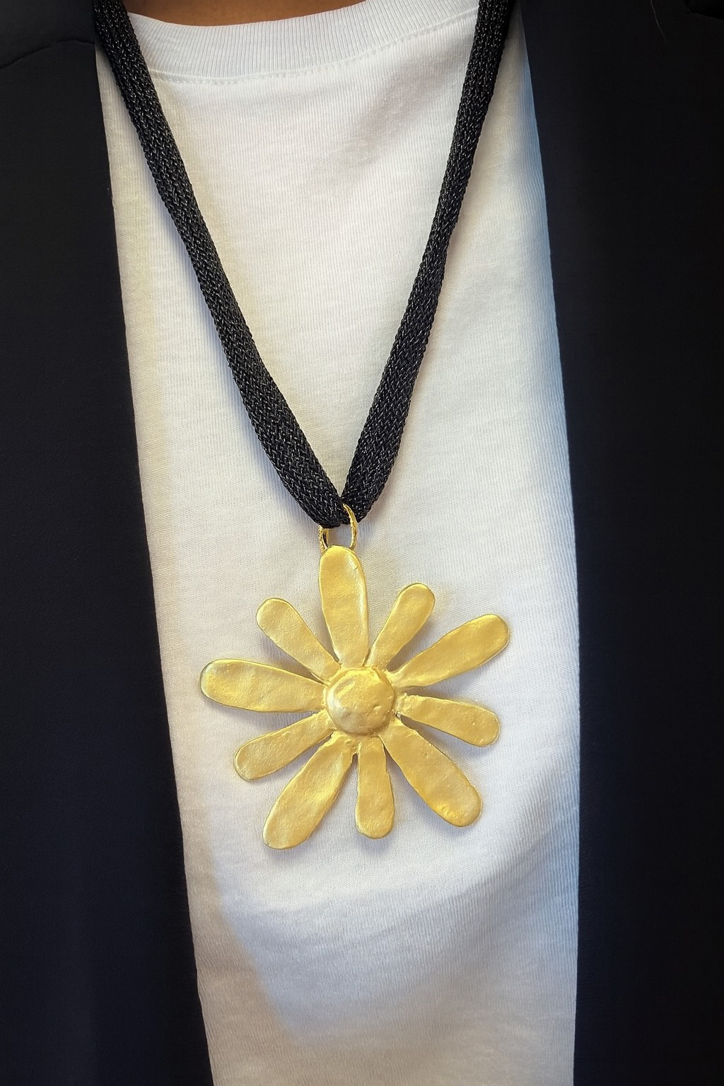 El collar Marga es una pieza de autor que combina fuerza y delicadeza en un diseño único. Su protagonista es una gran margarita en metal dorado martelé, trabajada a mano para resaltar su carácter artesanal y orgánico. El colgante descansa sobre un cordón textil negro de malla , que aporta contraste y realza aún más el brillo cálido del dorado.