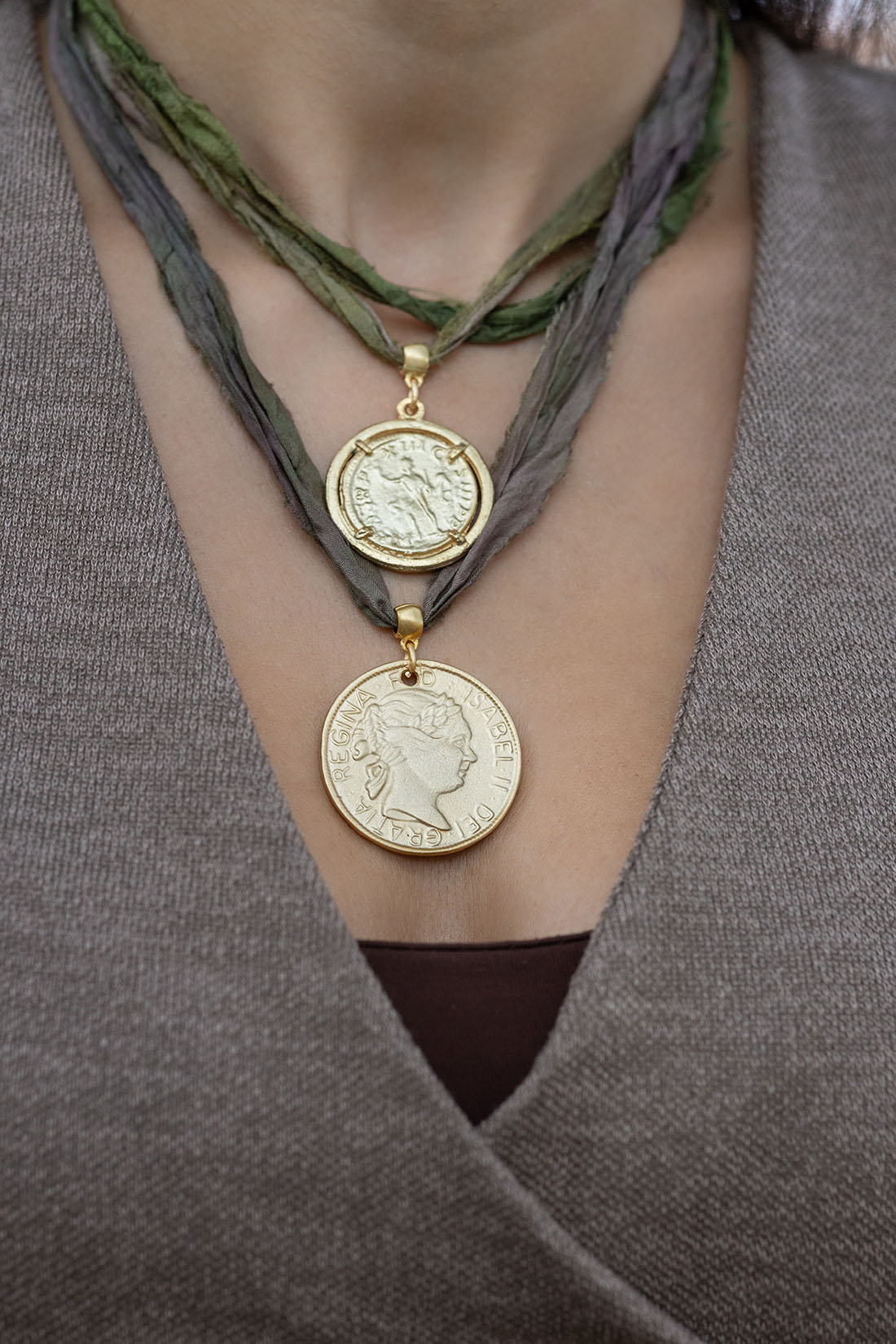 Cintas de seda sari en tonos verdes y tierra abrazan medallas doradas que evocan la fuerza natural y la elegancia orgánica del bosque.