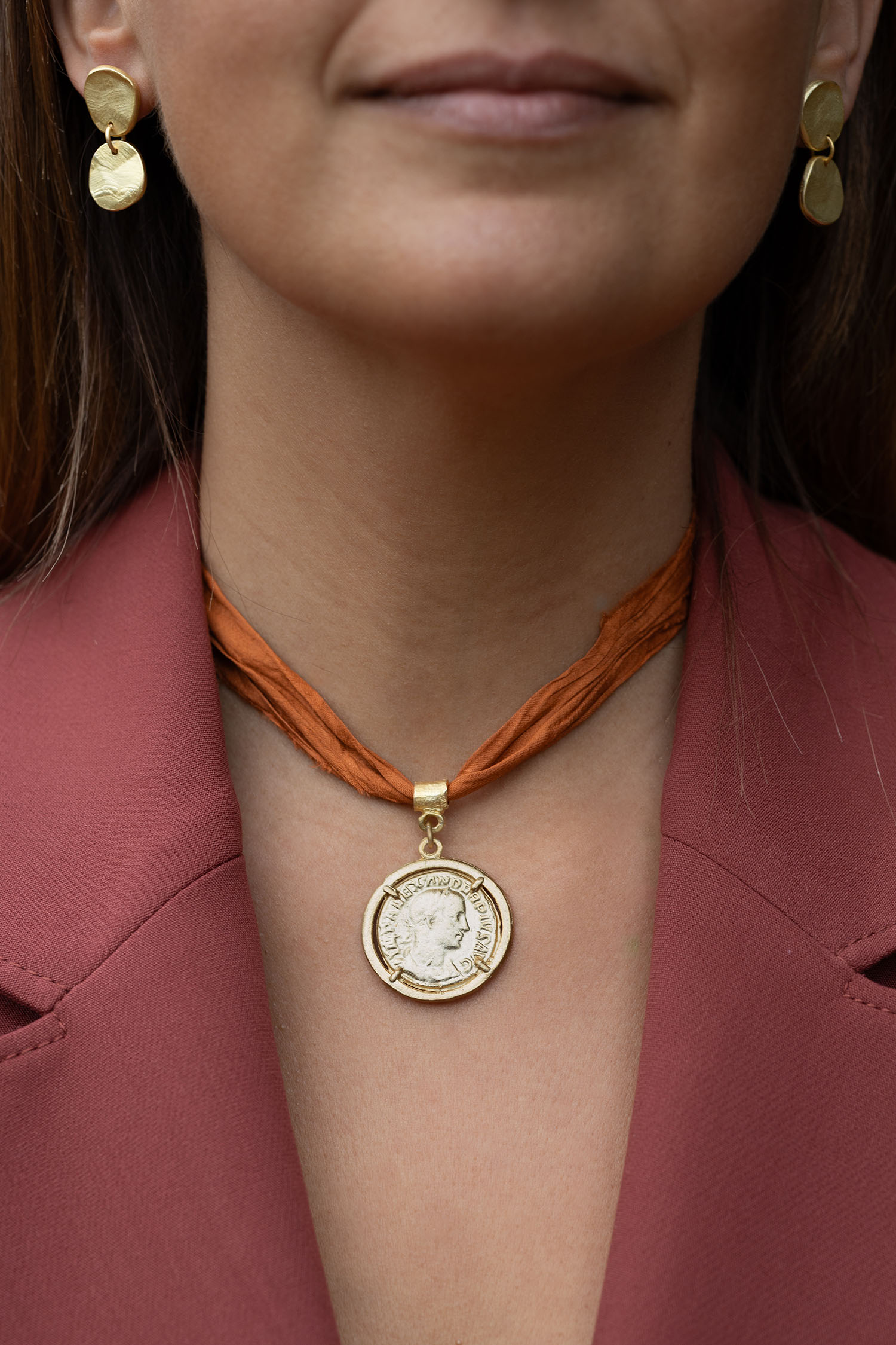 COLLAR CON MEDALLÓN INSPIRADO EN MONEDAS ANTIGUAS , ENMARCADO EN DORADO Y COLGADO DE SDA SARI RECICLADA EN TONO TERRACOTA