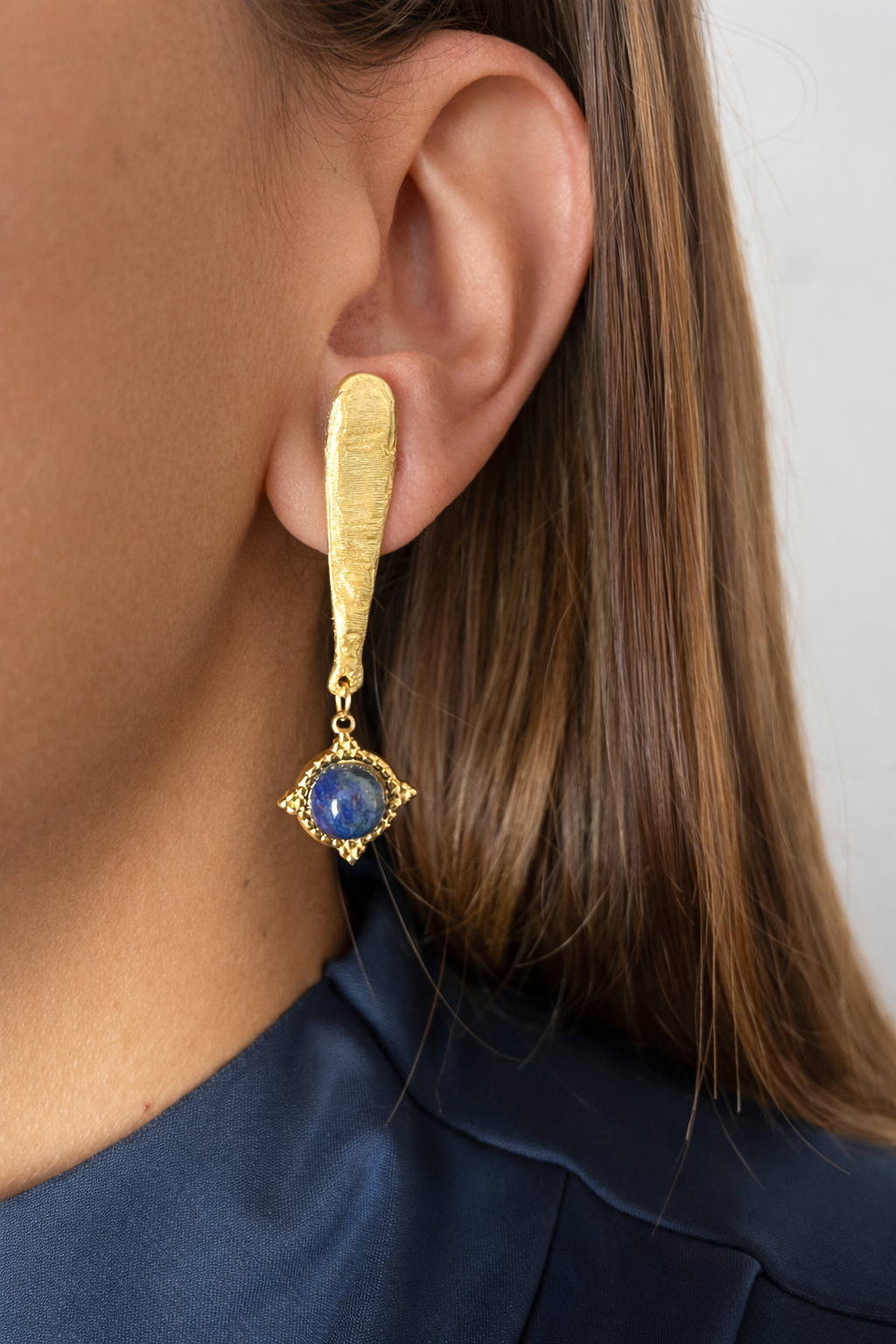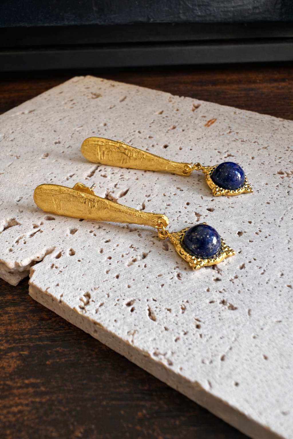Pendientes de inspiración artesanal que combinan una base texturizada en acabado dorado con una elegante piedra natural de lapislázuli. Su diseño alargado y ligero aporta movimiento y luz al rostro, mientras el azul profundo de la piedra crea un contraste sofisticado con el oro.