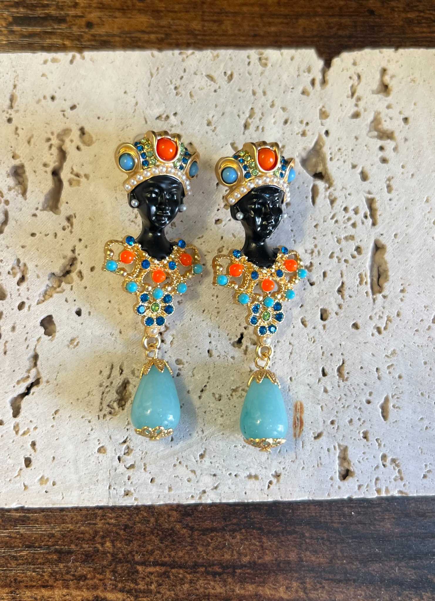Pendientes largos de inspiración joya, con figura central y composición de cristales en tonos azul y coral, rematados con una lágrima en color turquesa. Una pieza con carácter, luminosa y sofisticada, pensada para elevar cualquier look y convertirse en el centro de todas las miradas. Ideales para ocasiones especiales o para dar un toque único a un estilismo sencillo.