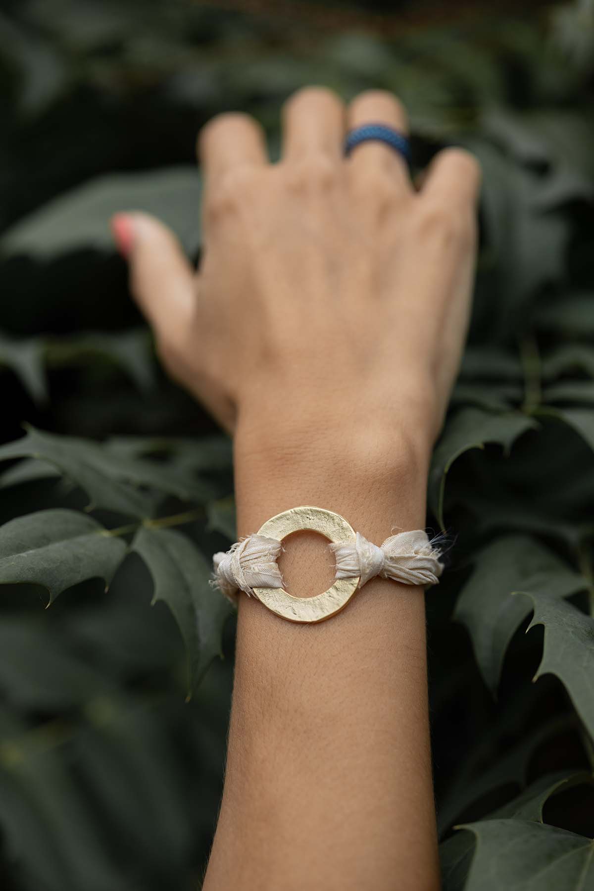 CADA PULSERA ESTA HECHA CON SEDA SARI RECICLADA Y UNA PIEZA METALICA MARTILLEADA EN ORO MATE. EDICION LIMITADA.